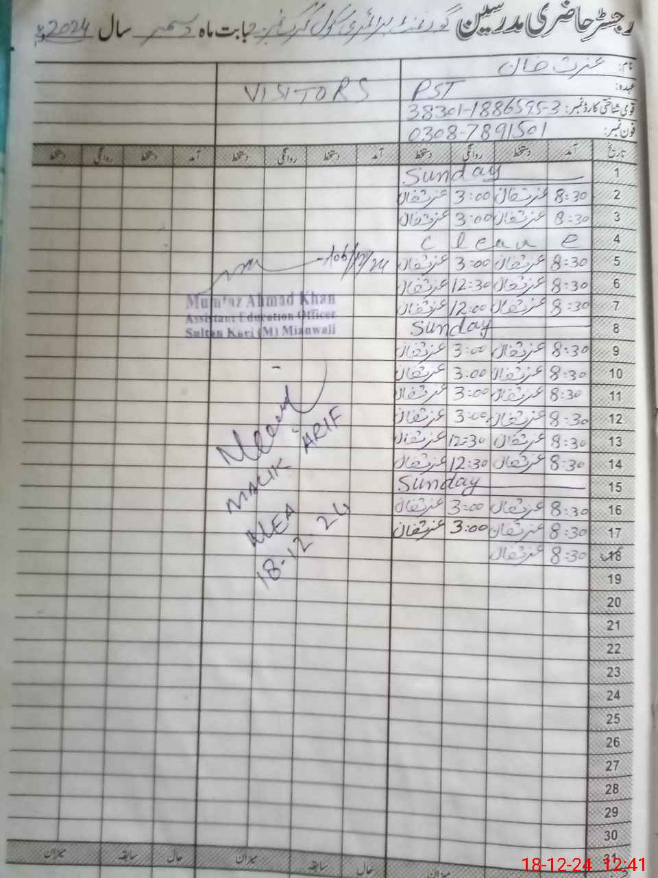 | Remarks (Use Separate Page if Required): NSB record not available Cash book not available Teacher Mr Gul Badshah marked as absent as no intimation regarding any training etc was provided to DMO office | |||||