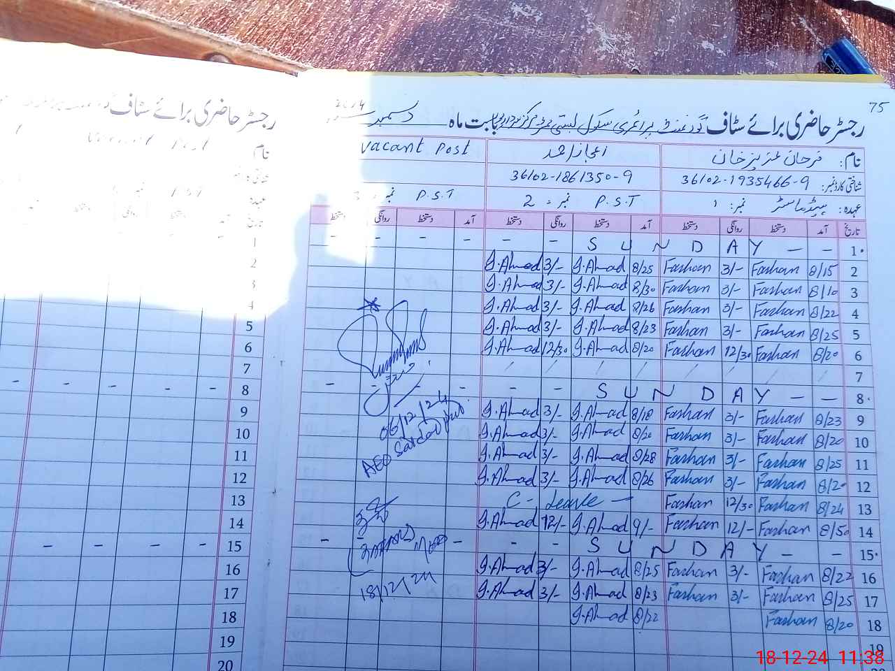 | CNIC | Full Name | Designation | R/C | Absence during last cal. month |