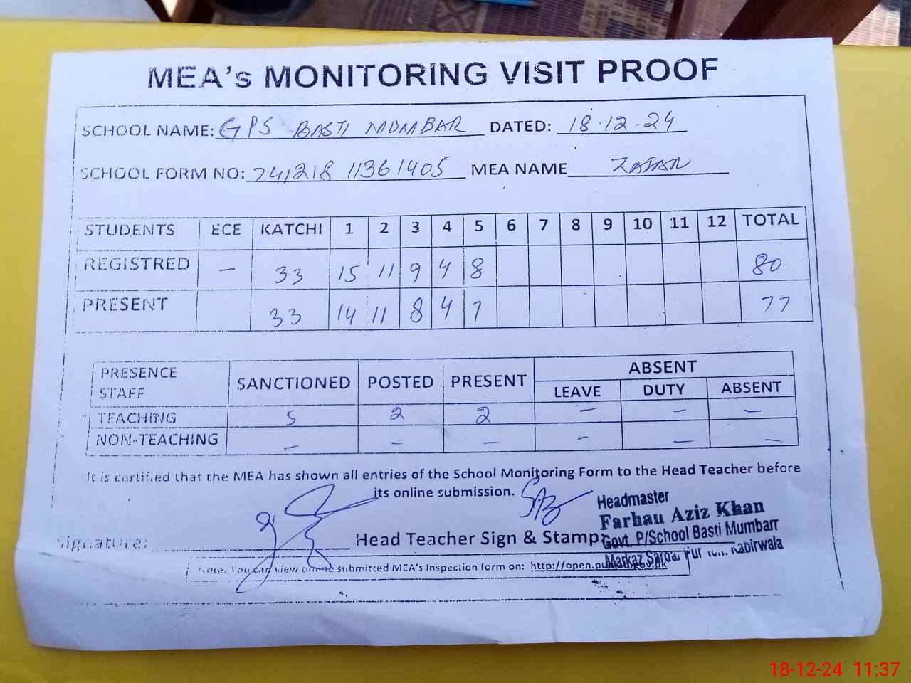 | Attendance Register | Head Teacher | MEA with School | Visit Proof |