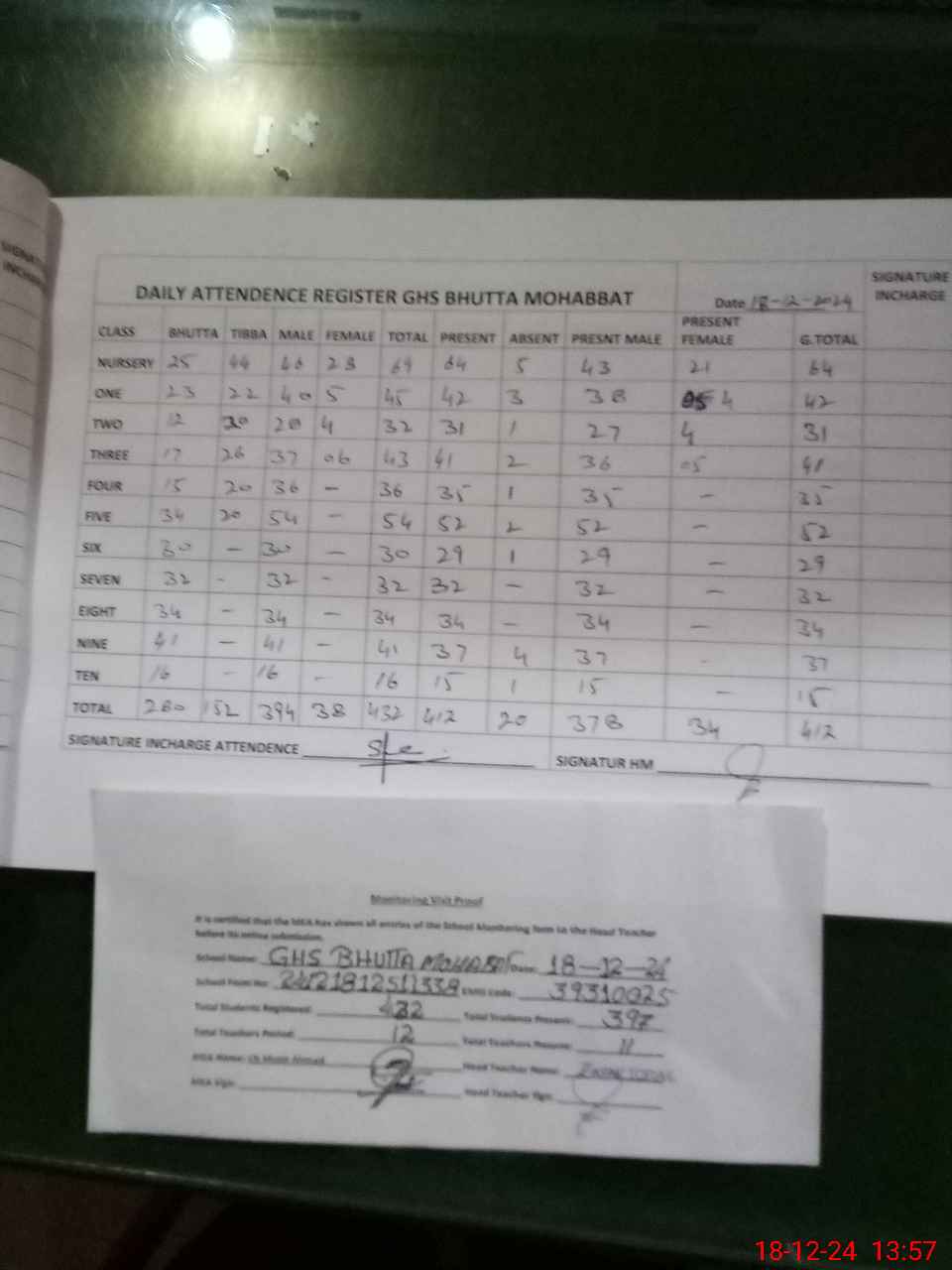 | Attendance Register | Head Teacher | MEA with School | Visit Proof |