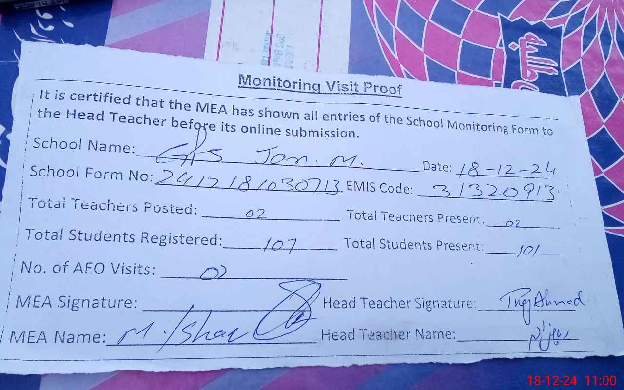 | EMIS Code: 31320913 | Name of School: GPS JAN MUHAMMAD | |||