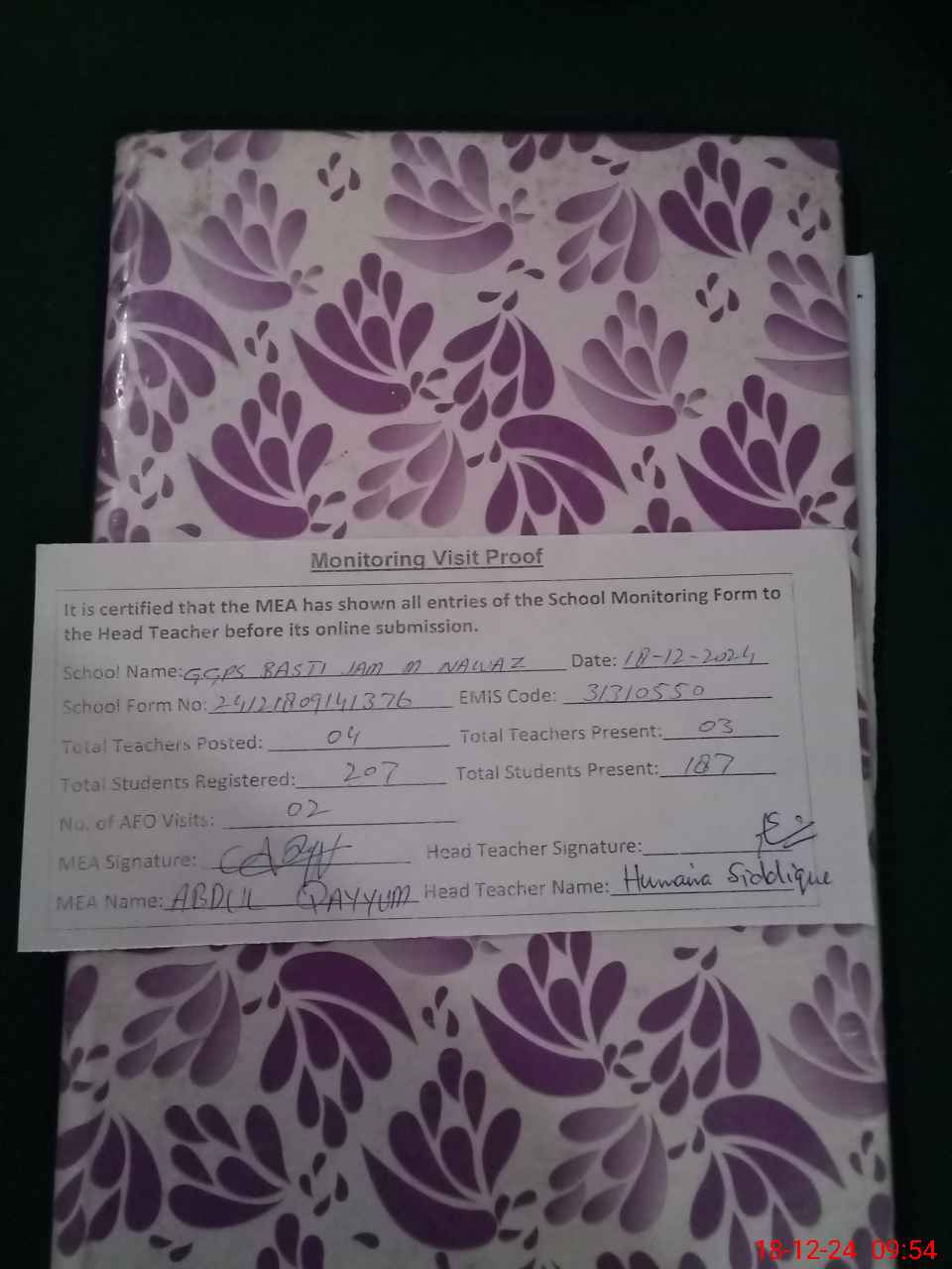| Attendance Register | Head Teacher | MEA with School | Visit Proof |