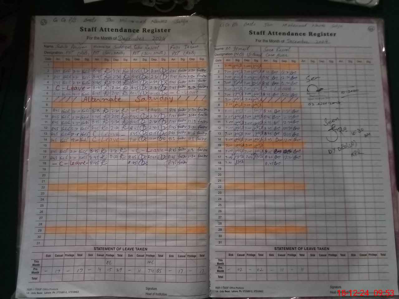 | CNIC | Full Name | Designation | R/C | Absence During Last Calender Month |