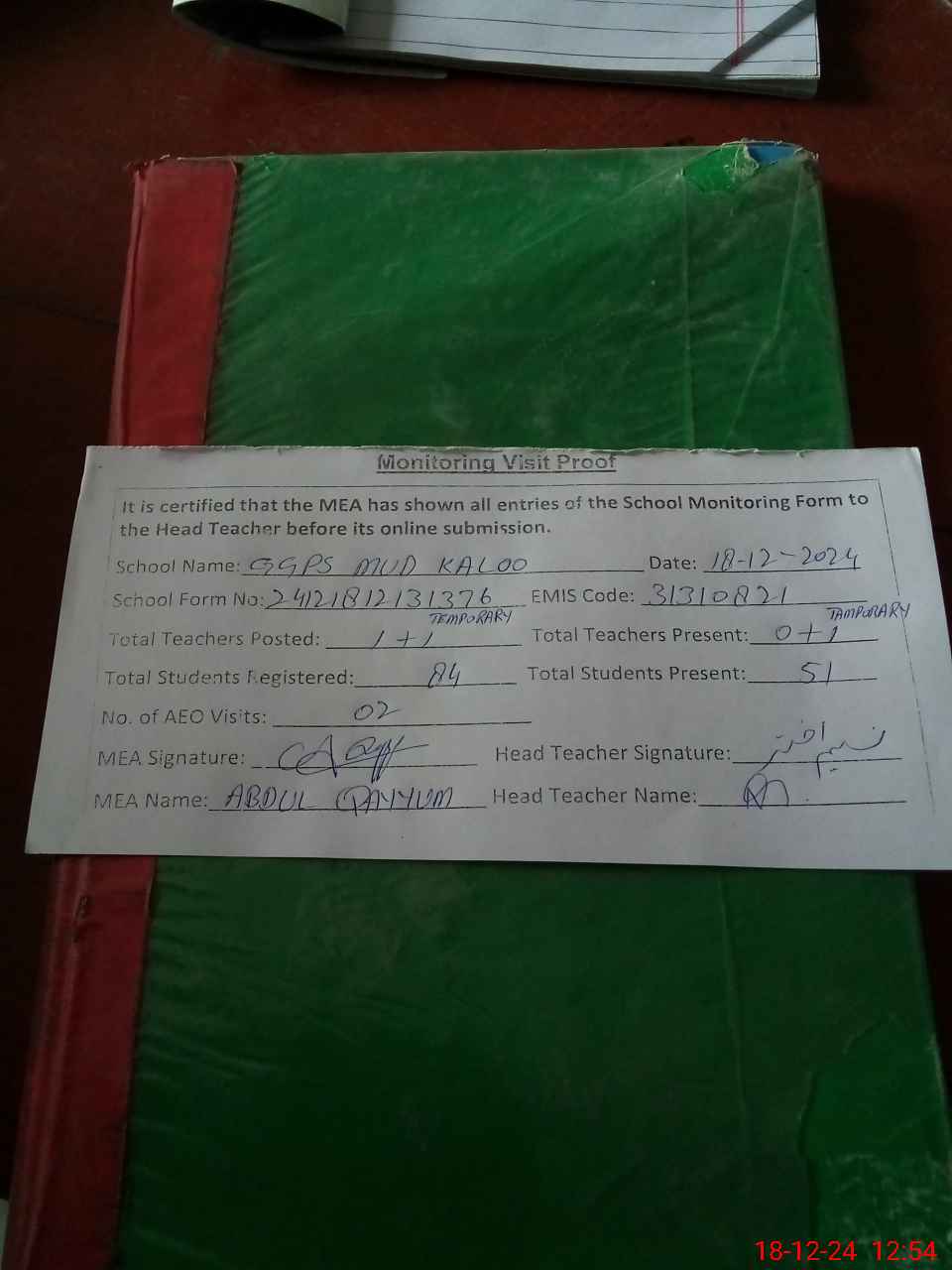 | EMIS Code: 31310821 | Name of School: GGPS MUD KALOO | |||