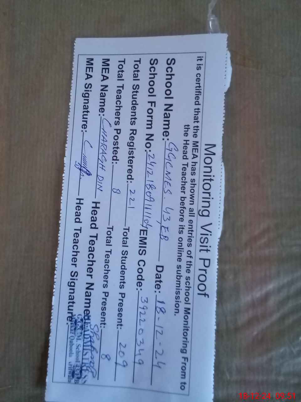 | Attendance Register | Head Teacher | MEA with School | Visit Proof |