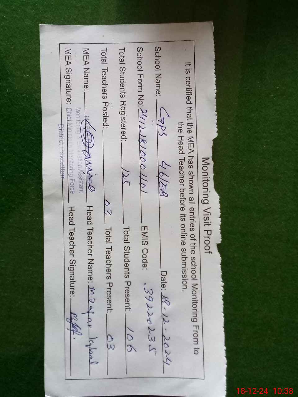 | Certified that this School was Inspected by the Undersigned MEA/DMO Today and the Information Stated Above is as Per Record. | |||||
