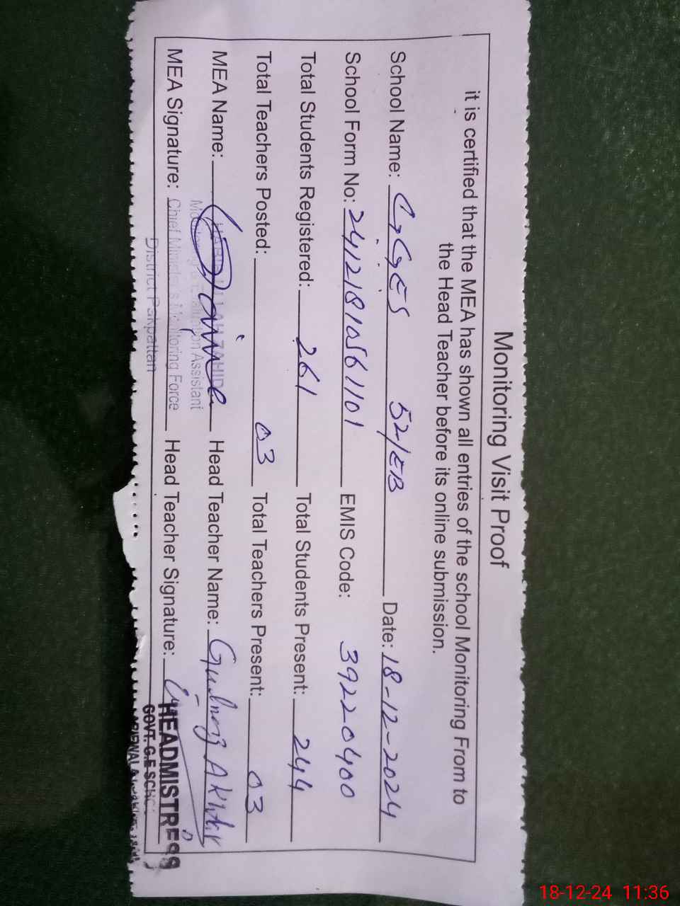 | Attendance Register | Head Teacher | MEA with School | Visit Proof |