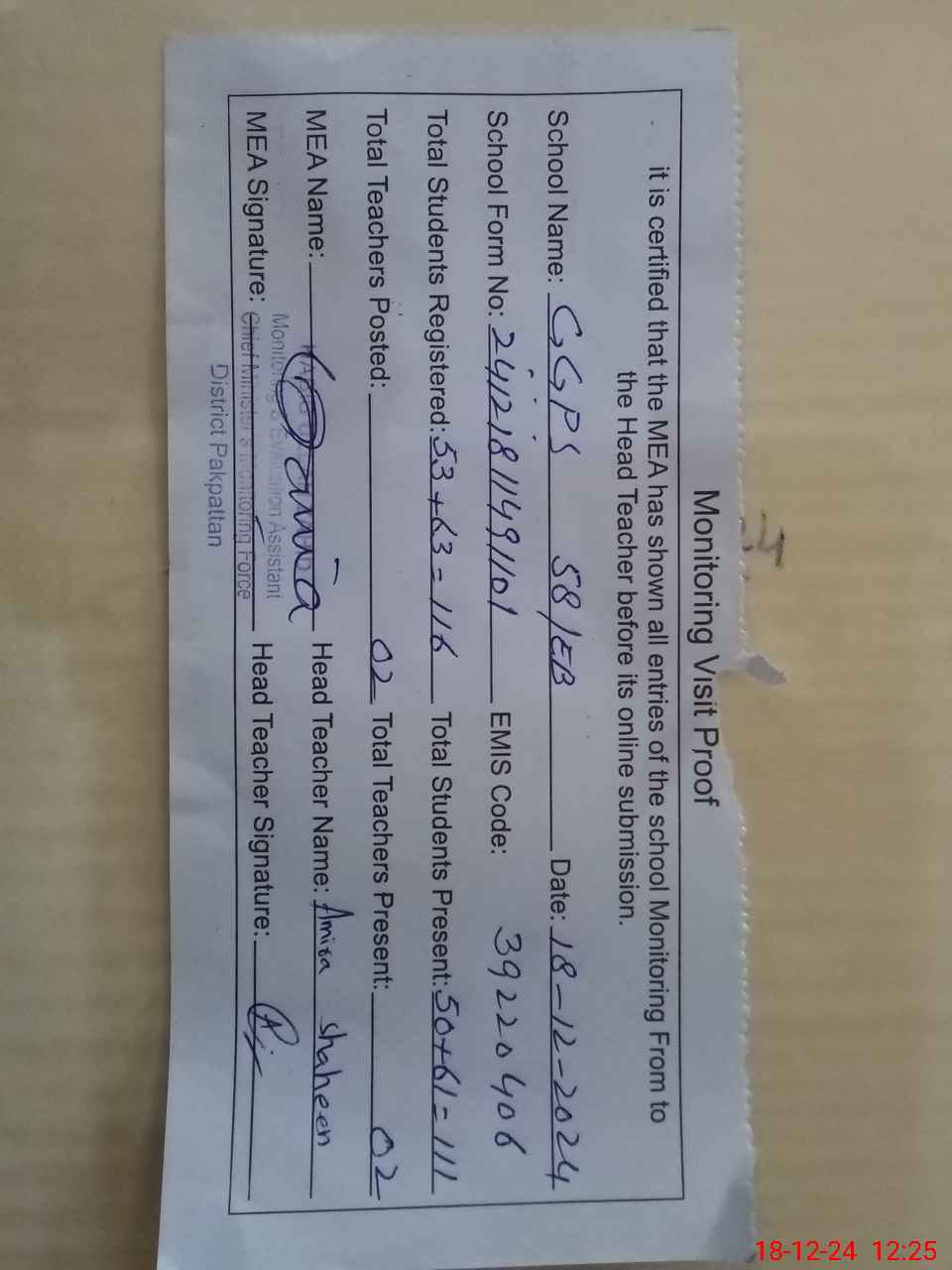 | Attendance Register | Head Teacher | MEA with School | Visit Proof |