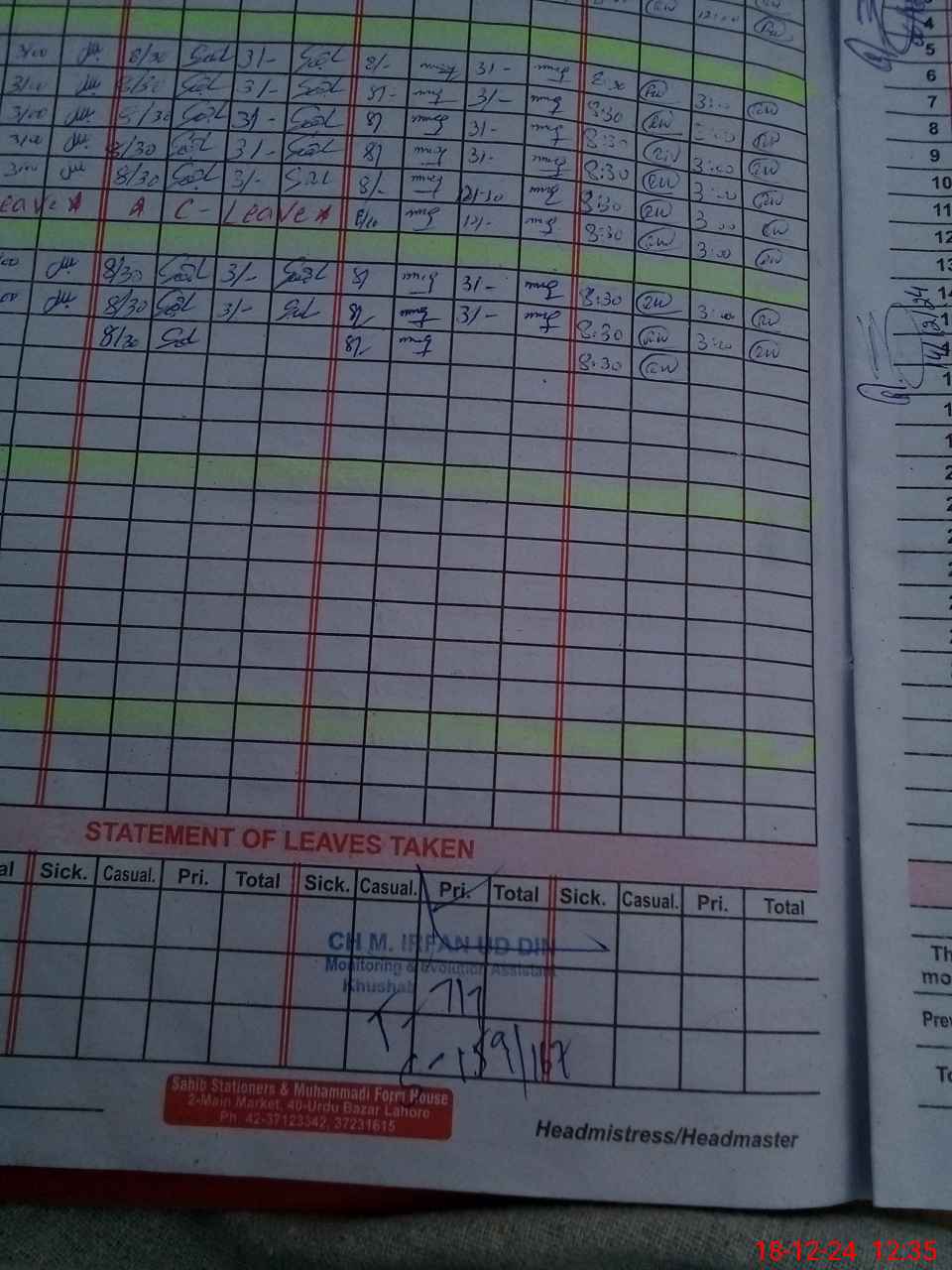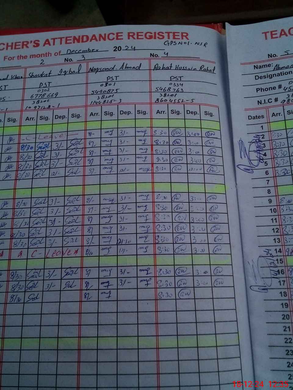 | CNIC | Full Name | Designation | R/C | Absence During Last Calender Month |