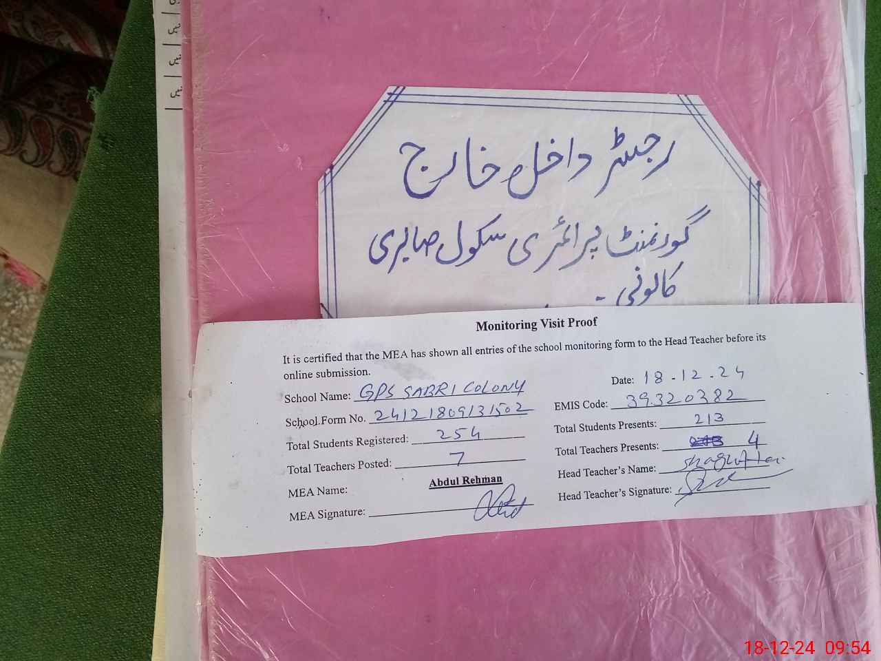 | EMIS Code: 39320382 | Name of School: GPS SABRI COLONY | |||