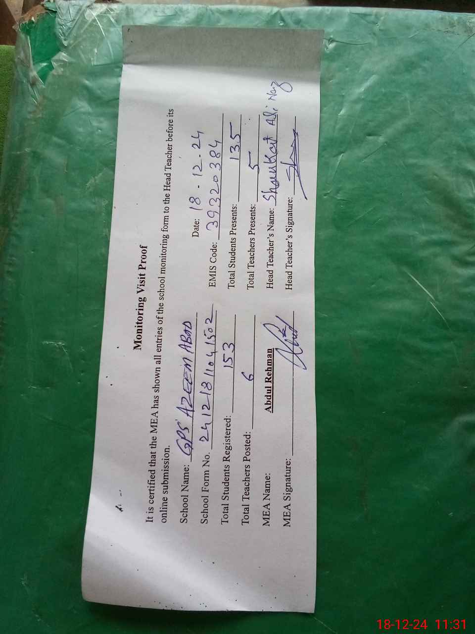 | EMIS Code: 39320384 | Name of School: GPS AZEEM ABAD , OKARA | |||