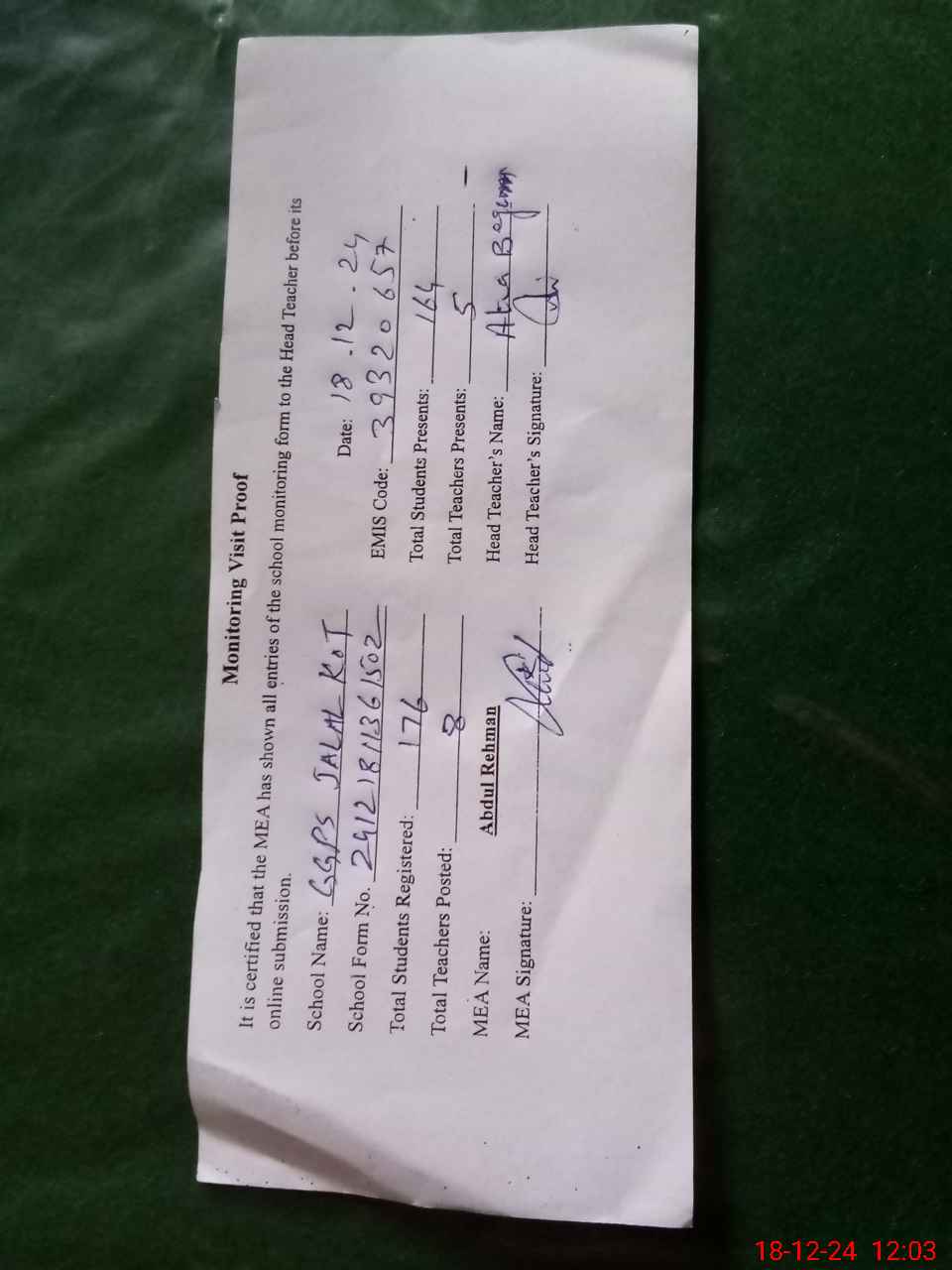 | Attendance Register | Head Teacher | MEA with School | Visit Proof |