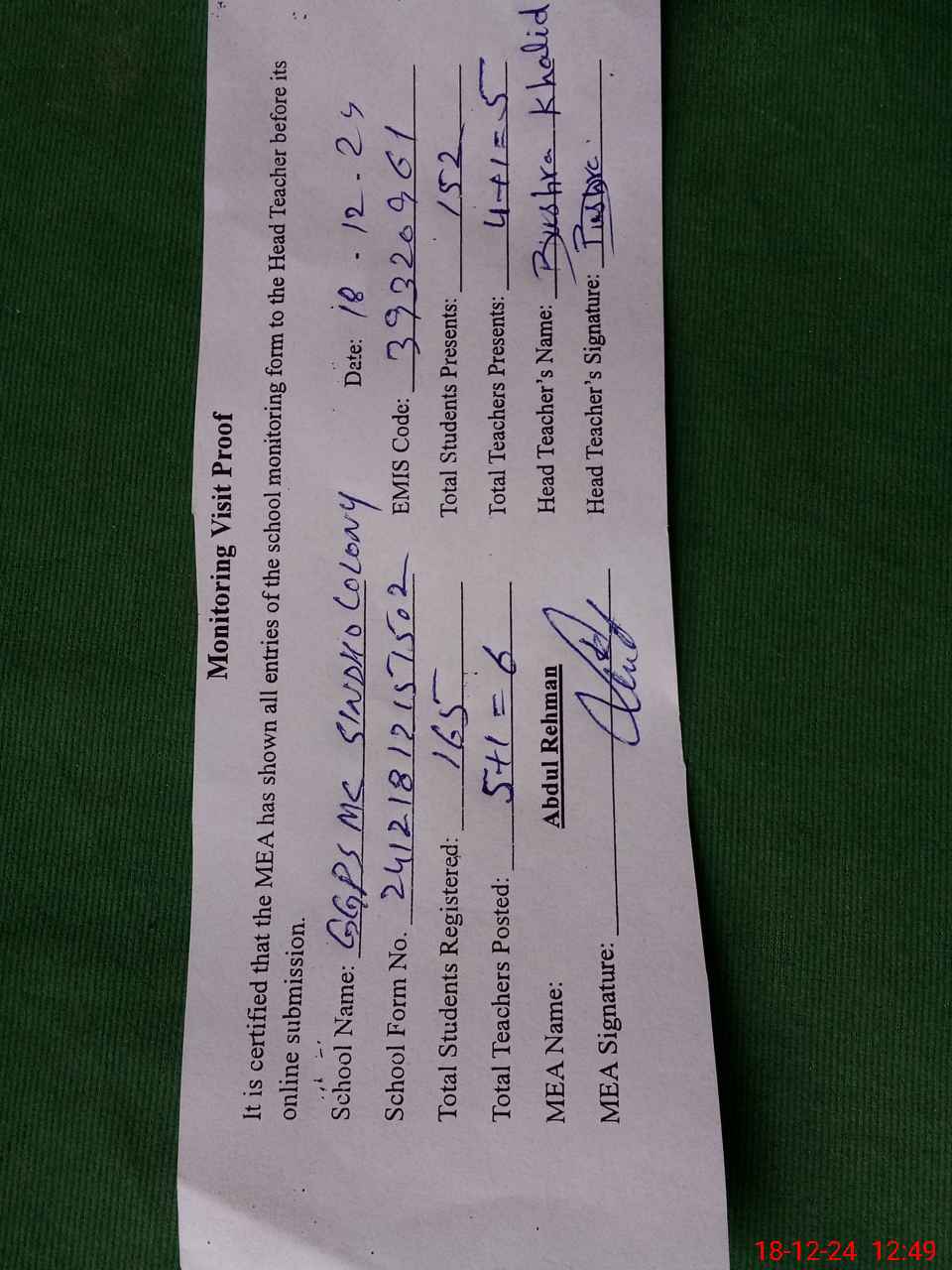 | Attendance Register | Head Teacher | MEA with School | Visit Proof |