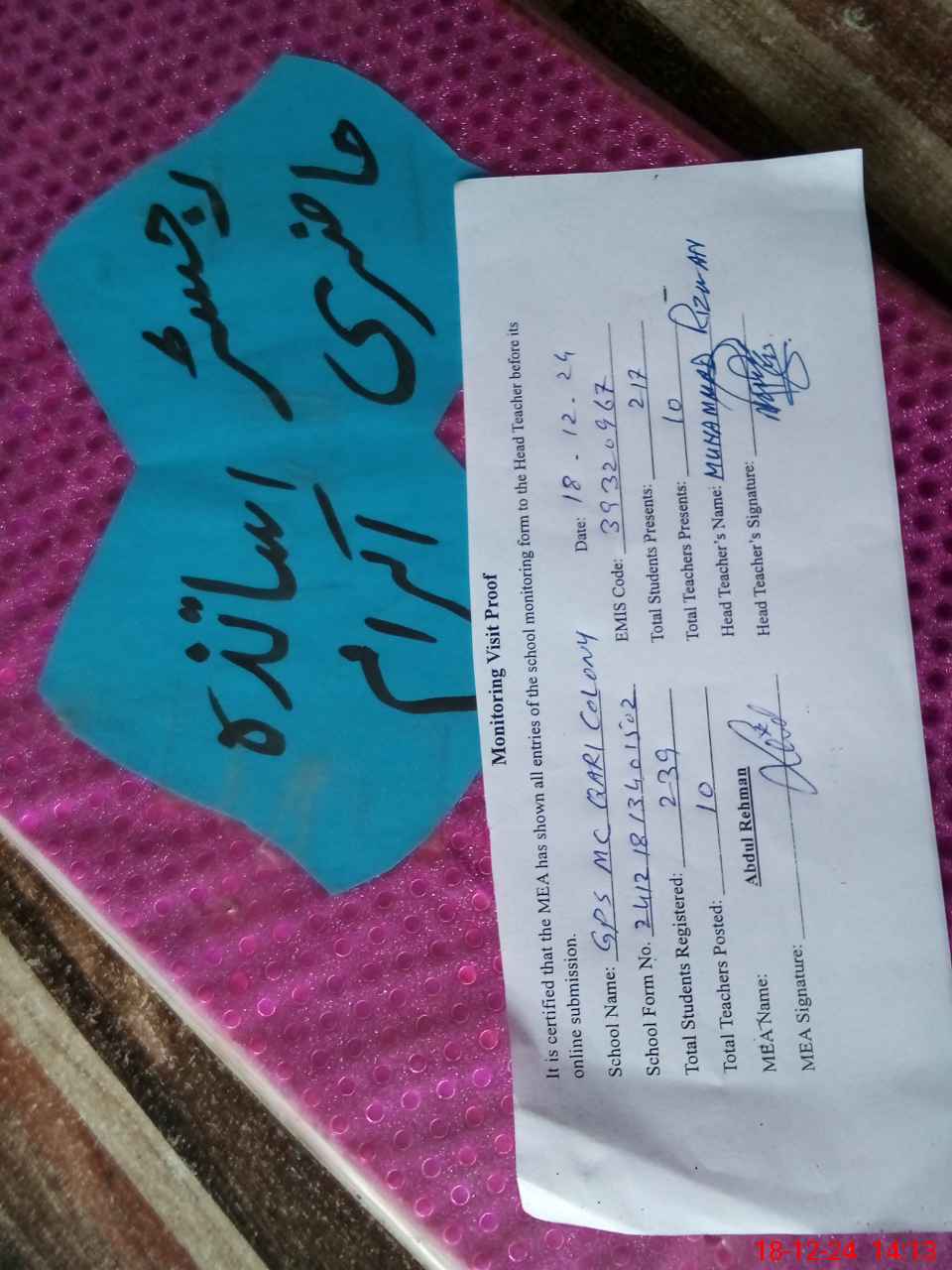 | EMIS Code: 39320967 | Name of School: GPS MC QARI COLONY | |||
