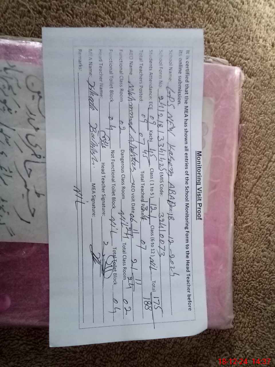 | Certified that this School was Inspected by the Undersigned MEA/DMO Today and the Information Stated Above is as Per Record. | |||||