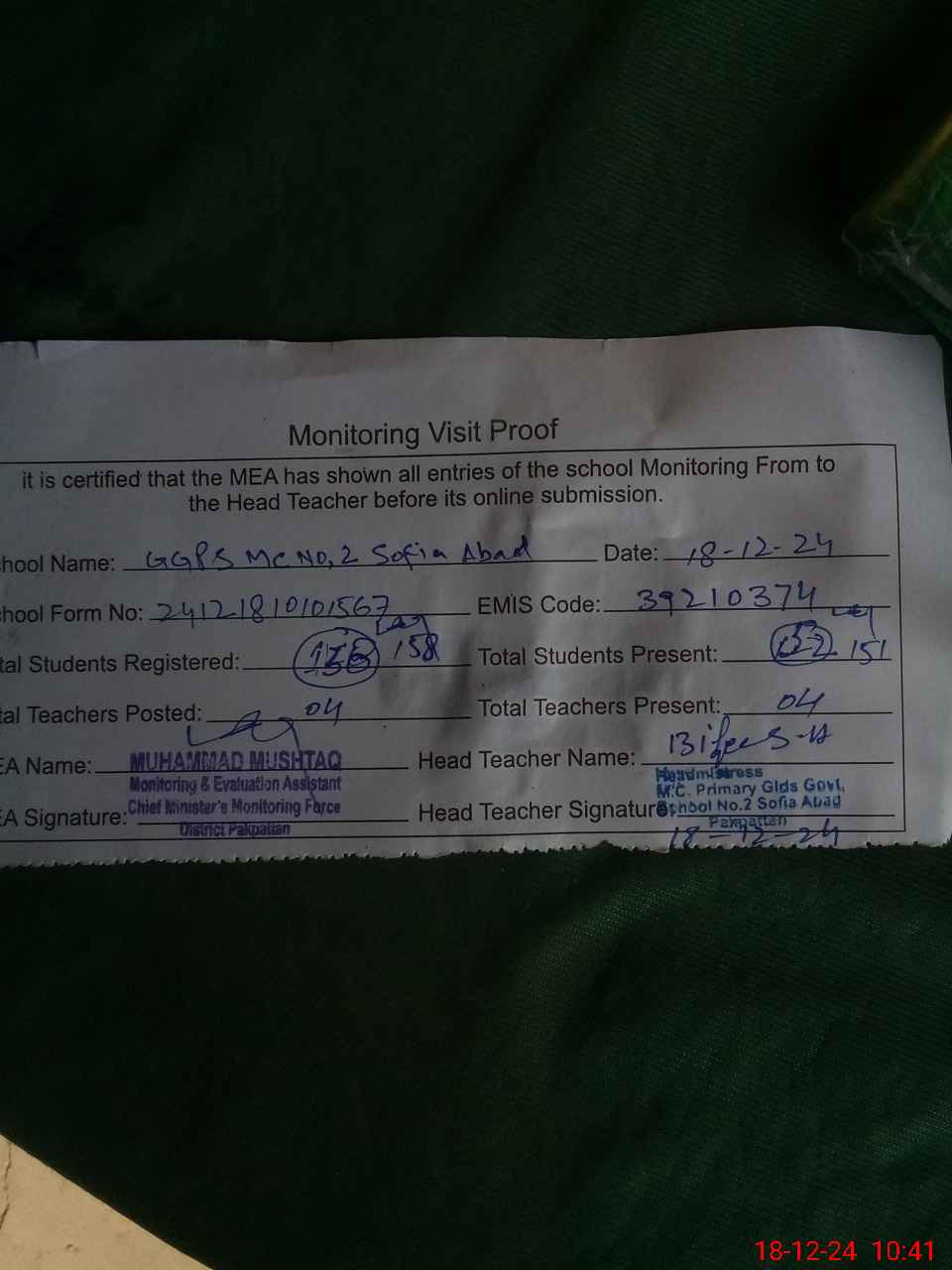 | Attendance Register | Head Teacher | MEA with School | Visit Proof |