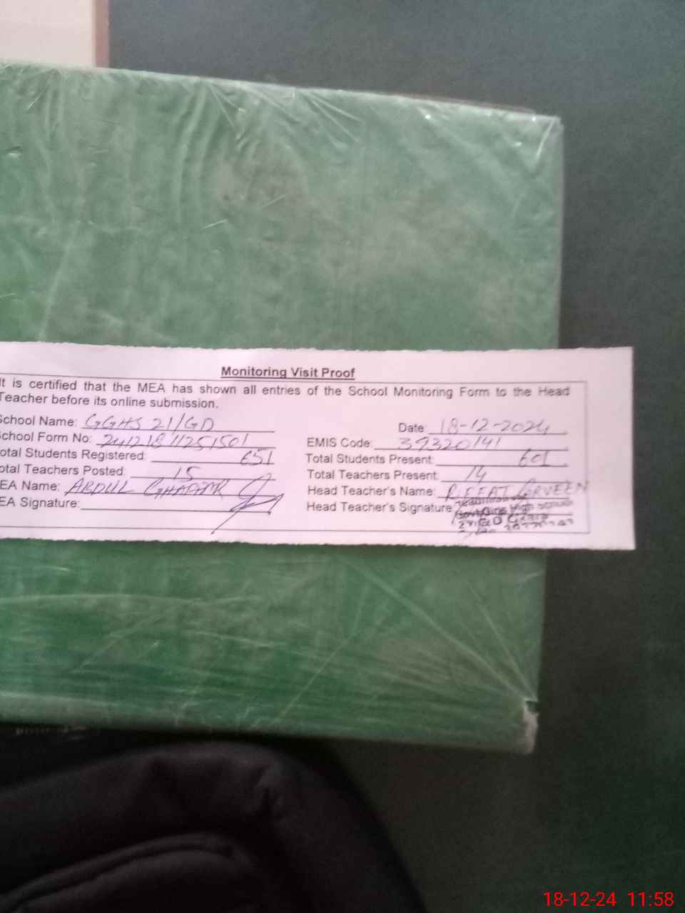 | Attendance Register | Head Teacher | MEA with School | Visit Proof |