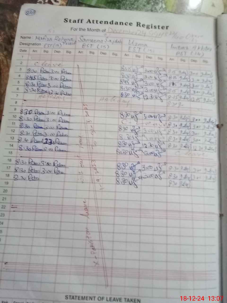 | CNIC | Full Name | Designation | R/C | Absence During Last Calender Month |