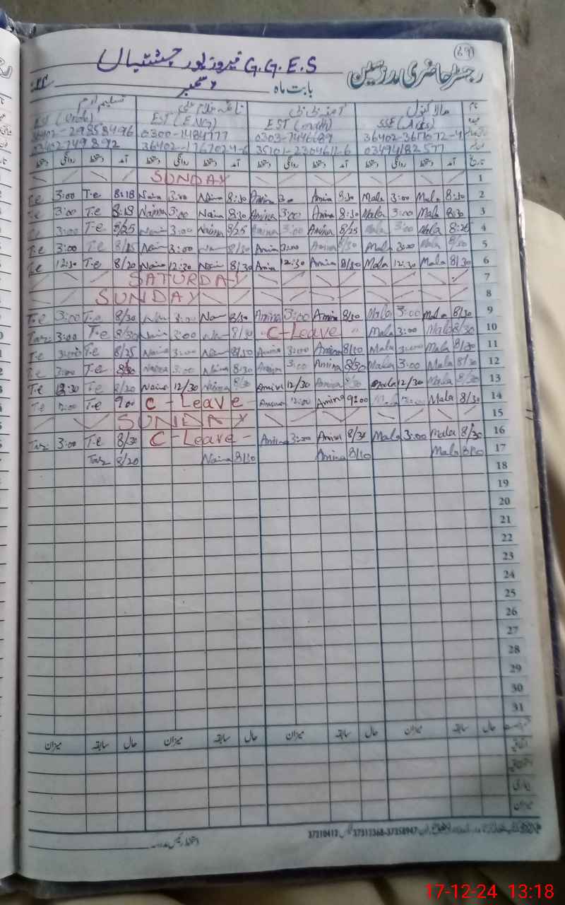 | CNIC | Full Name | Designation | R/C | Absence During Last Calender Month |