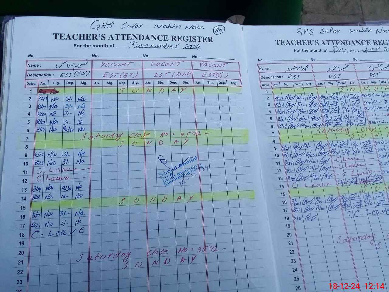 | CNIC | Full Name | Designation | R/C | Absence During Last Calender Month |