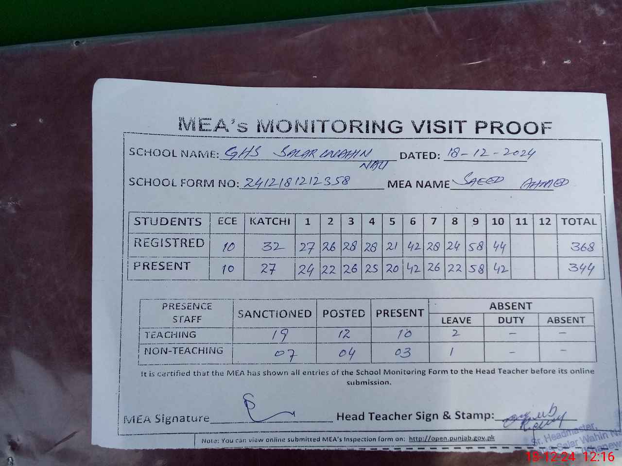 | Attendance Register | Head Teacher | MEA with School | Visit Proof |