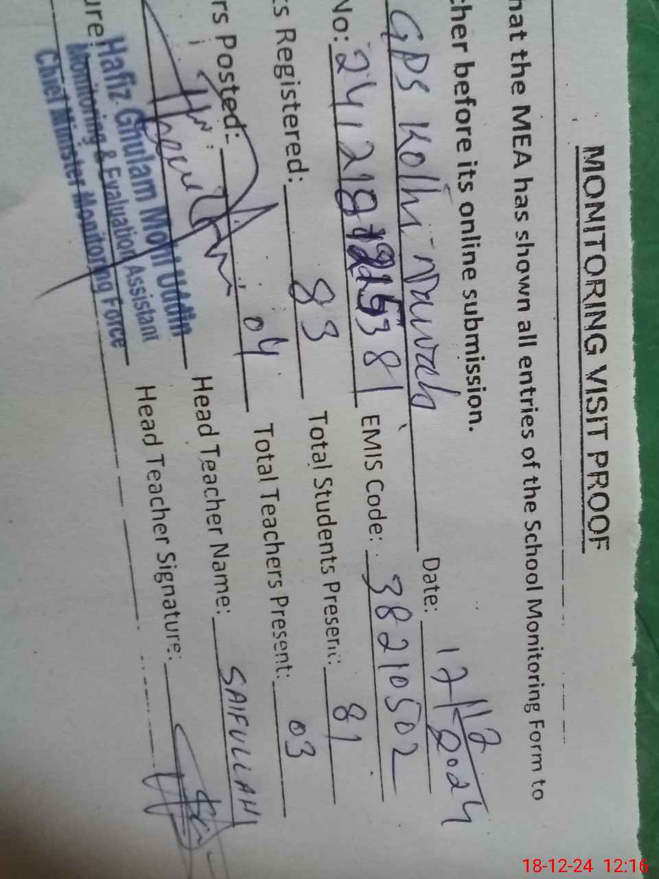 | EMIS Code: 38210502 | Name of School: GPS KOTHI NAWAB | |||