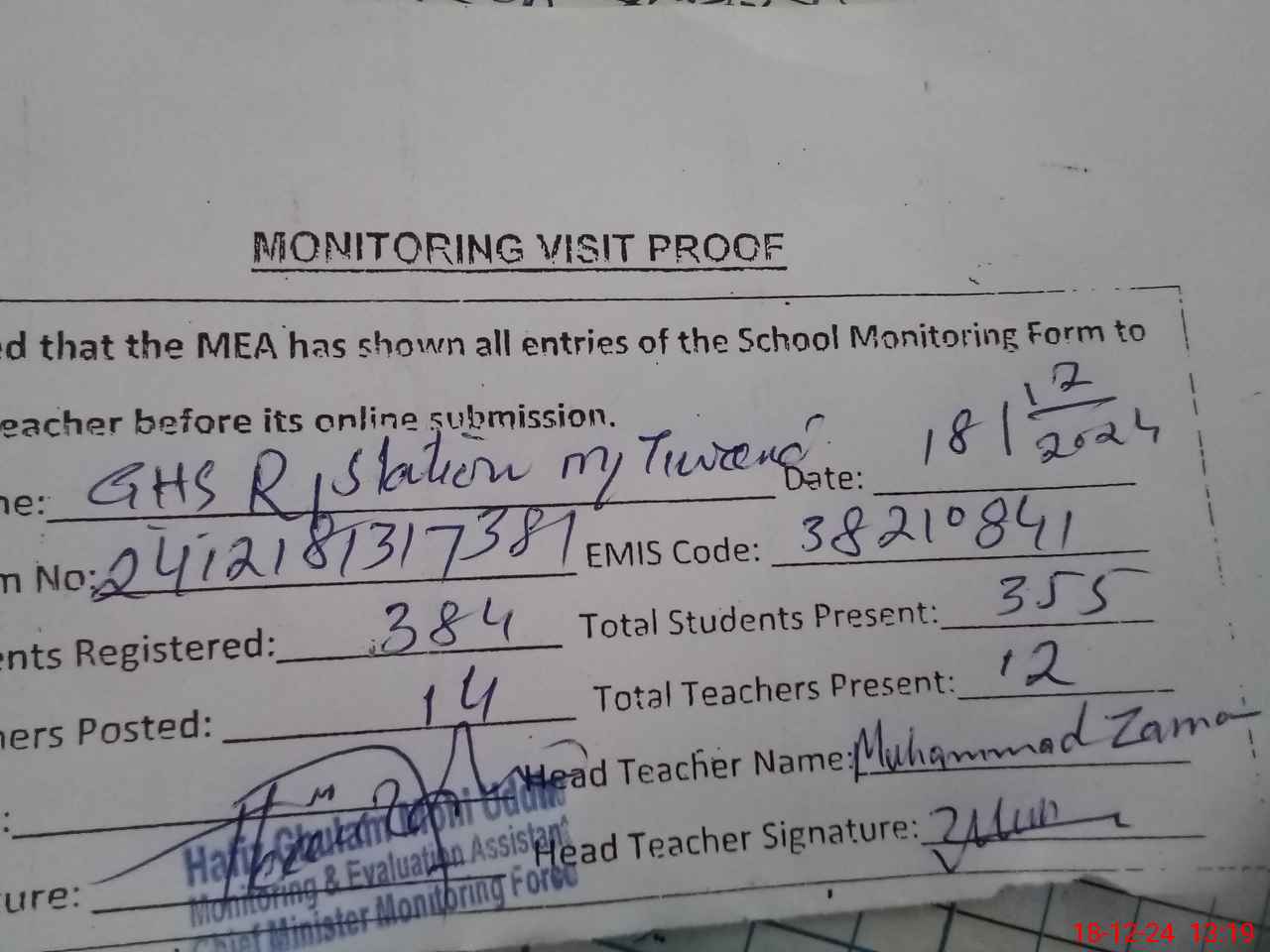 | Attendance Register | Head Teacher | MEA with School | Visit Proof |