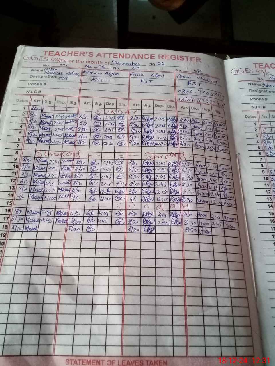 | CNIC | Full Name | Designation | R/C | Absence During Last Calender Month |
