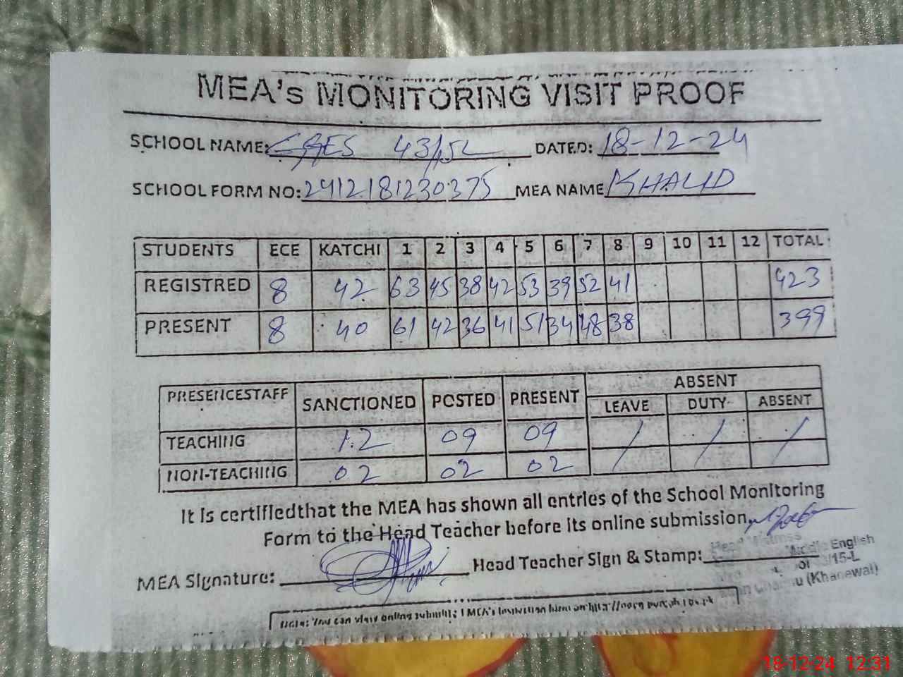 | Attendance Register | Head Teacher | MEA with School | Visit Proof |