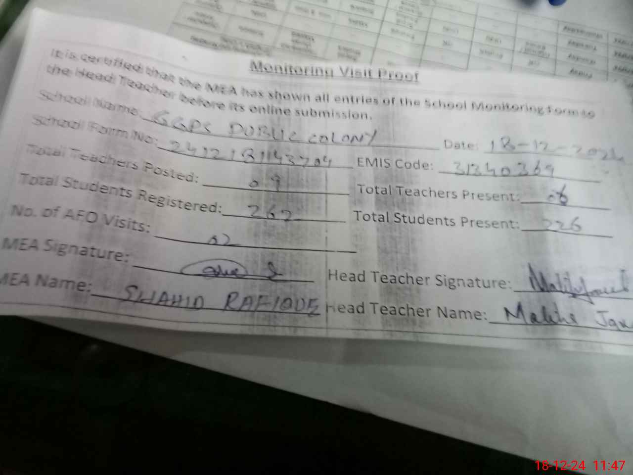 | Attendance Register | Head Teacher | MEA with School | Visit Proof |