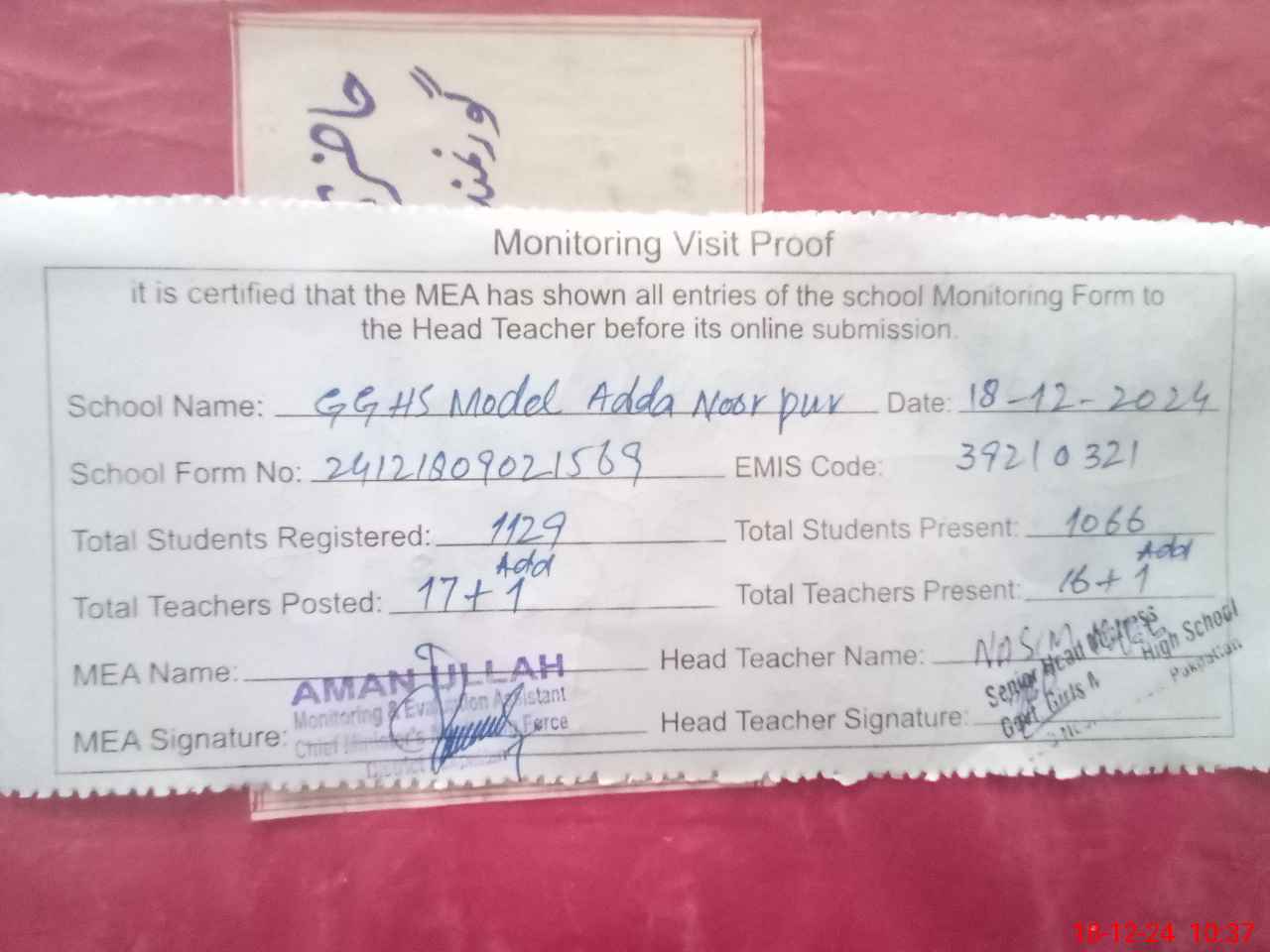 | Certified that this School was Inspected by the Undersigned MEA/DMO Today and the Information Stated Above is as Per Record. | |||||