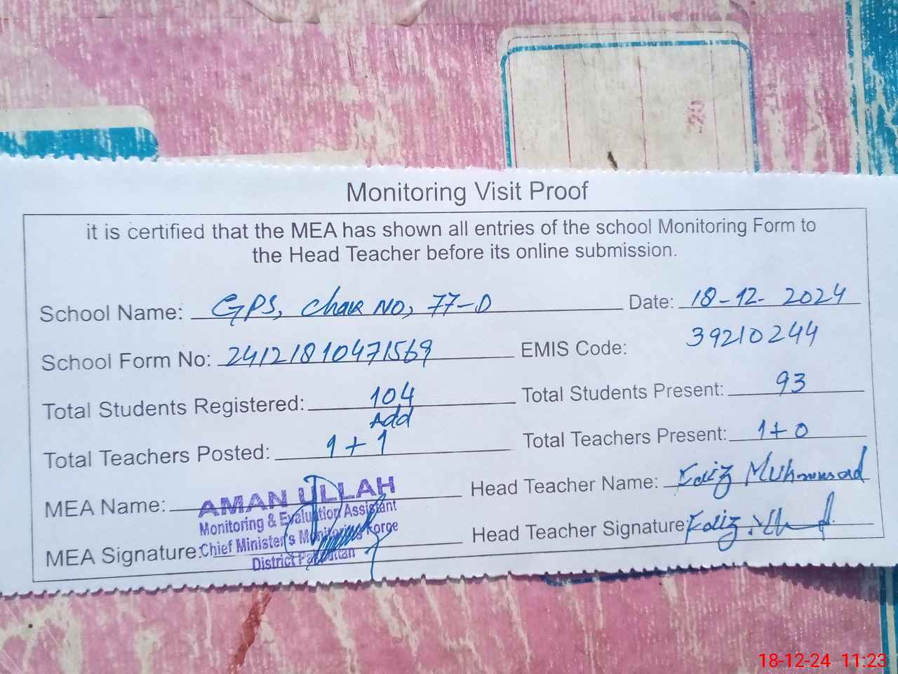 | EMIS Code: 39210244 | Name of School: GPS CHAK NO. 77 /D | |||