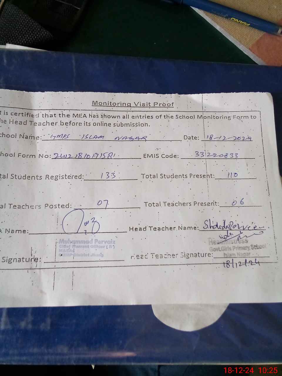 | EMIS Code: 33220833 | Name of School: GMPS ISLAM NAGAR | |||