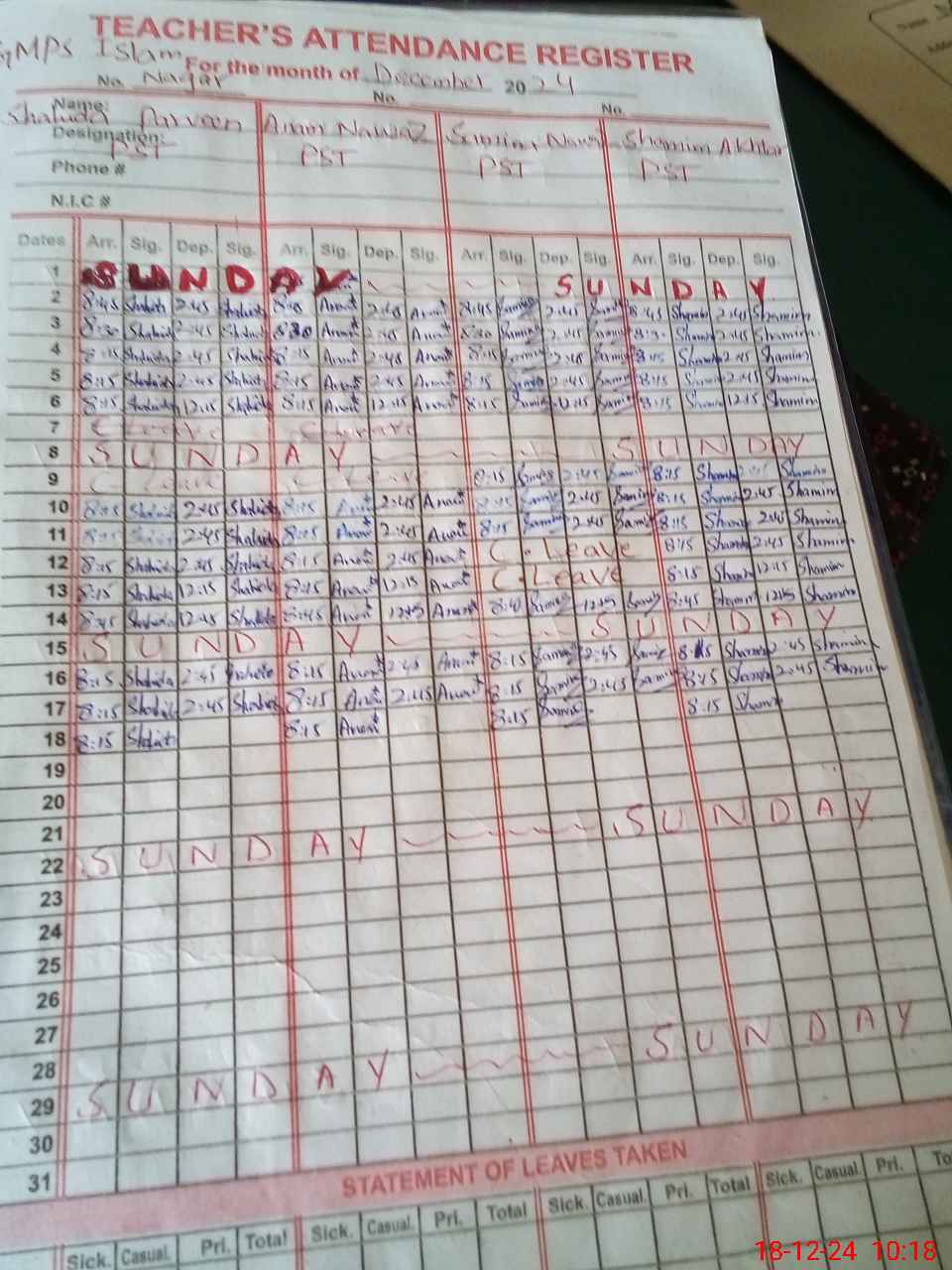 | Leave | Duty | Absent | Maternity | Medical | Ex- Pak |