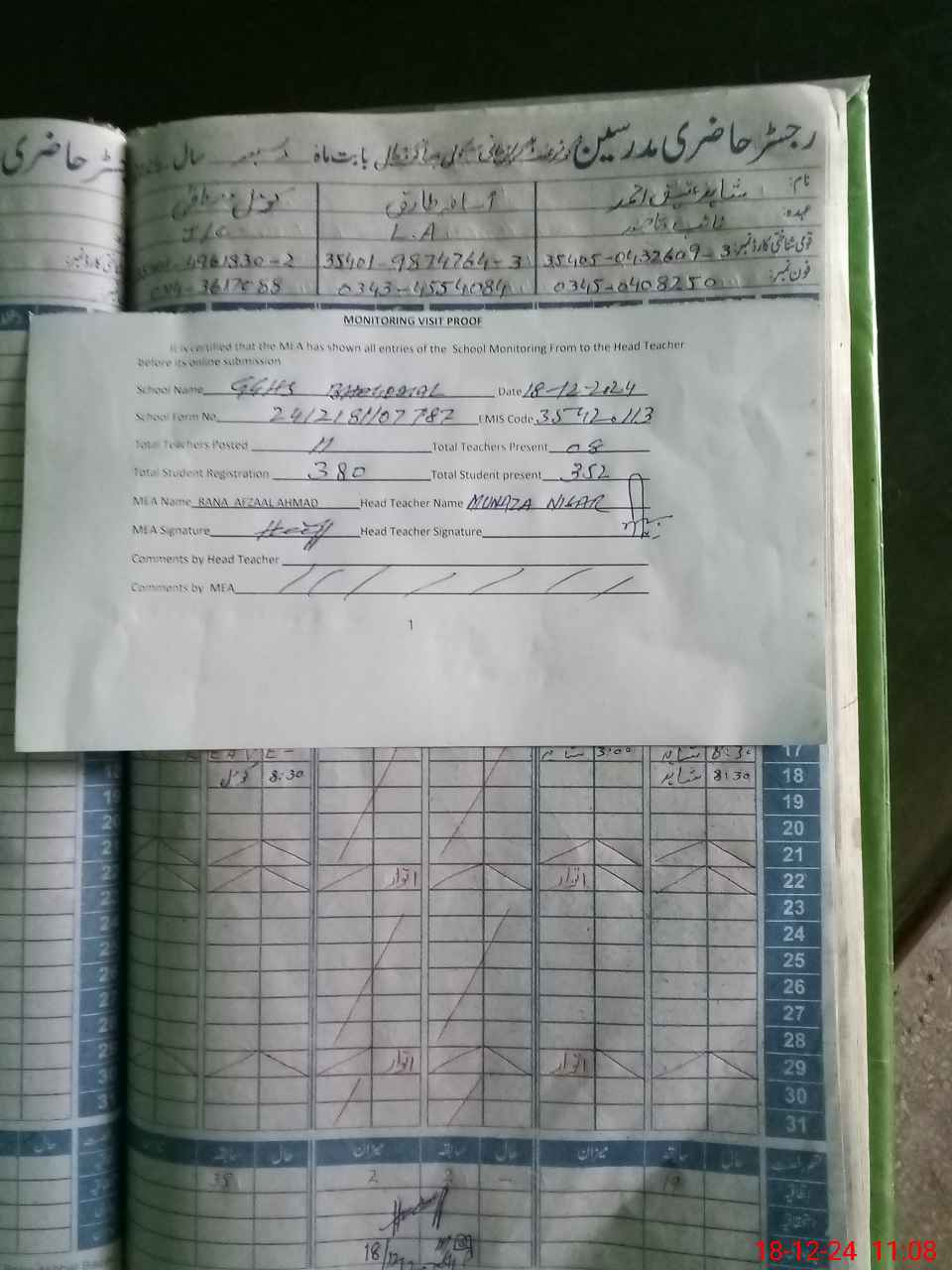 | Attendance Register | Head Teacher | MEA with School | Visit Proof |