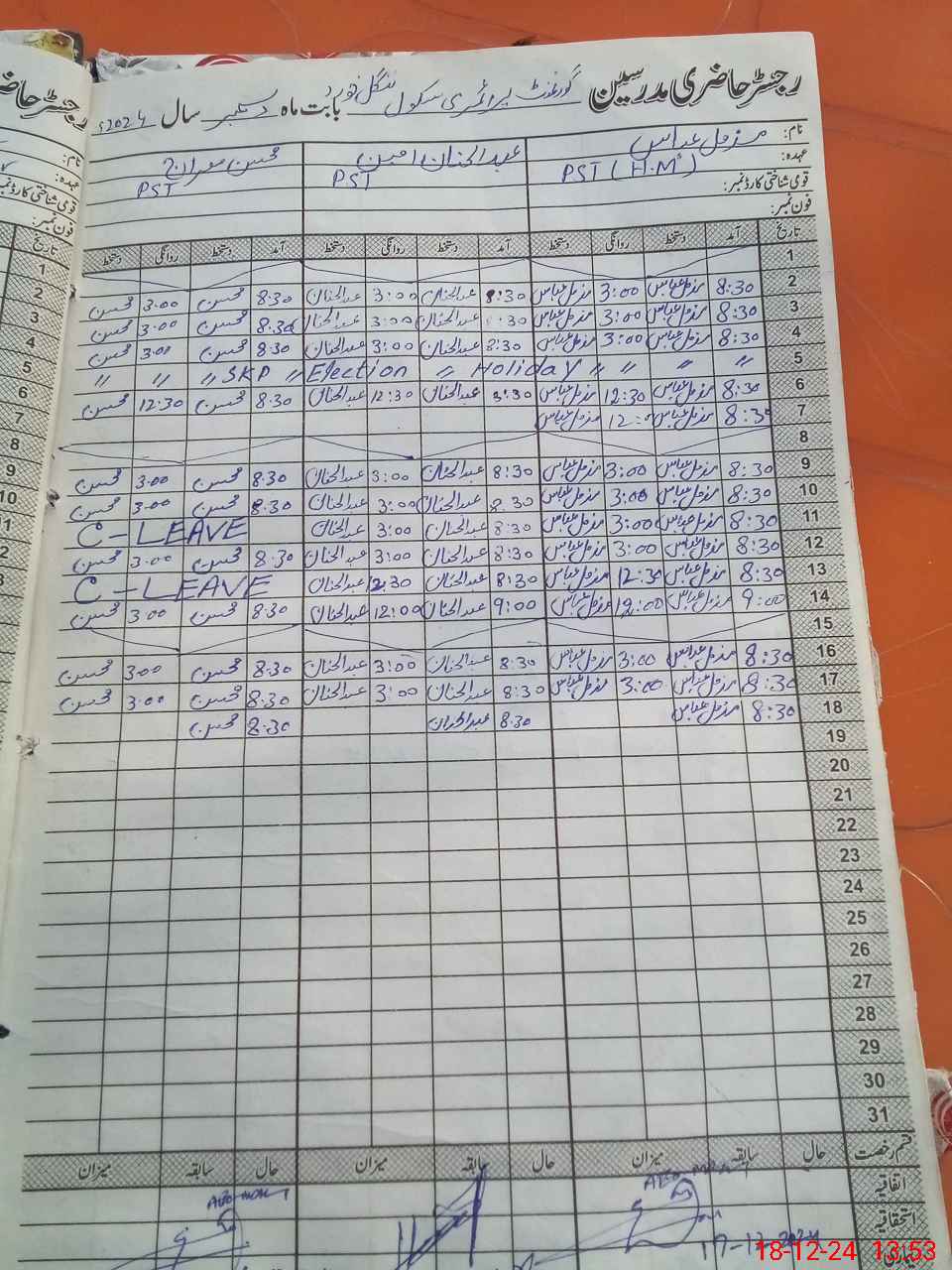 | CNIC | Full Name | Designation | R/C | Absence During Last Calender Month |