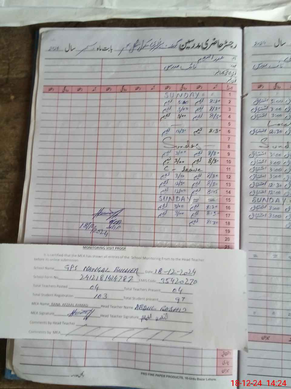 | Attendance Register | Head Teacher | MEA with School | Visit Proof |
