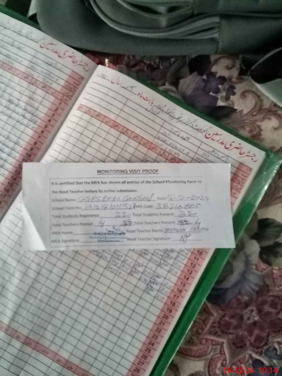 | Attendance Register | Head Teacher | MEA with School | Visit Proof |