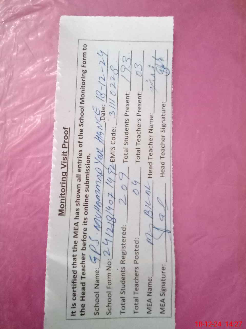 | Attendance Register | Head Teacher | MEA with School | Visit Proof |