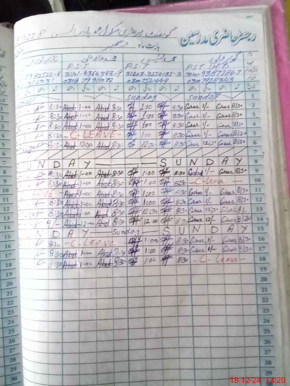 | CNIC | Full Name | Designation | R/C | Absence During Last Calender Month |