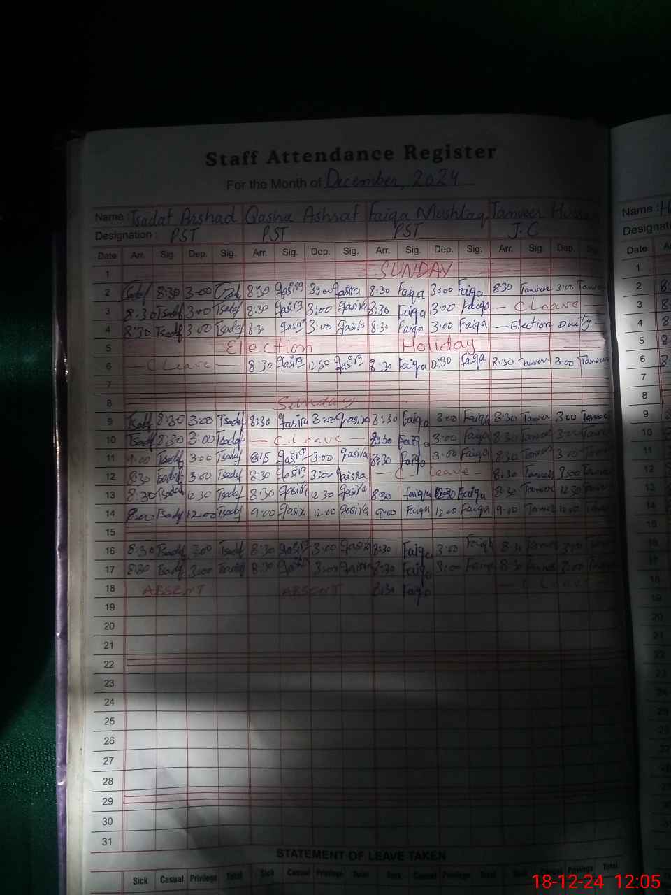 | 34**** | Ts**** Ar**** | 1 | 3 | 0 | 0 | 0 | 0 | 0 | 0 | 0 | 3 | Absent (Un-Authorized) | |