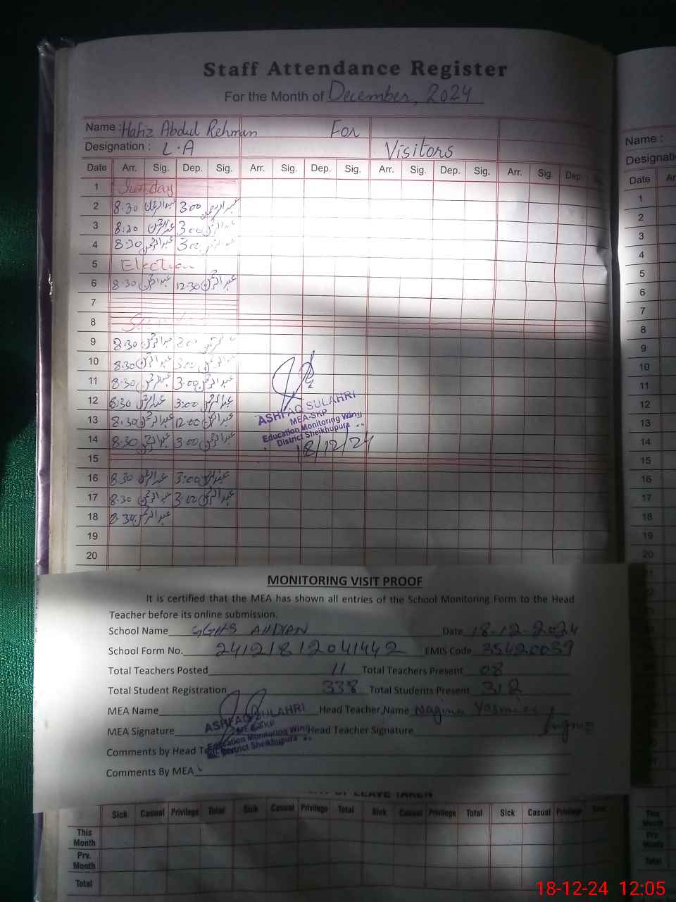 | Attendance Register | Head Teacher | MEA with School | Visit Proof |