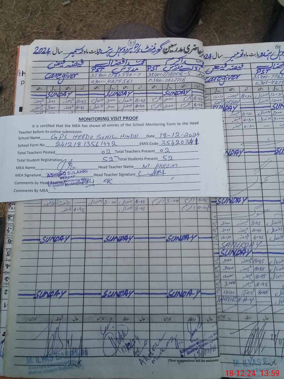 | Attendance Register | Head Teacher | MEA with School | Visit Proof |