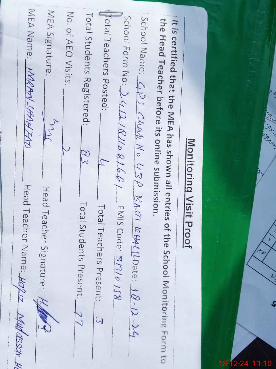 | Attendance Register | Head Teacher | MEA with School | Visit Proof |