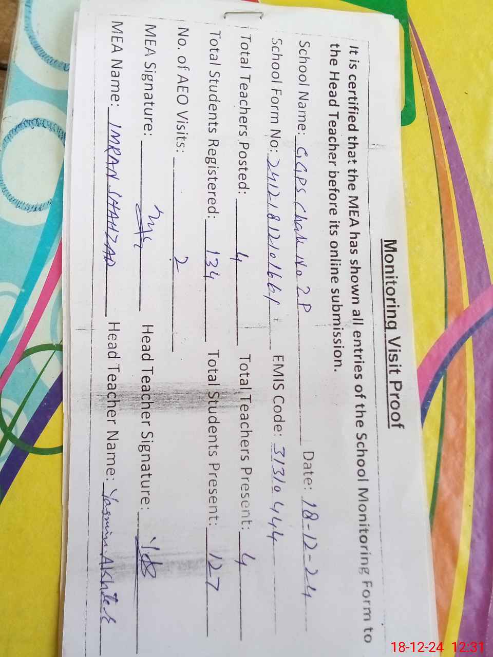 | Attendance Register | Head Teacher | MEA with School | Visit Proof |