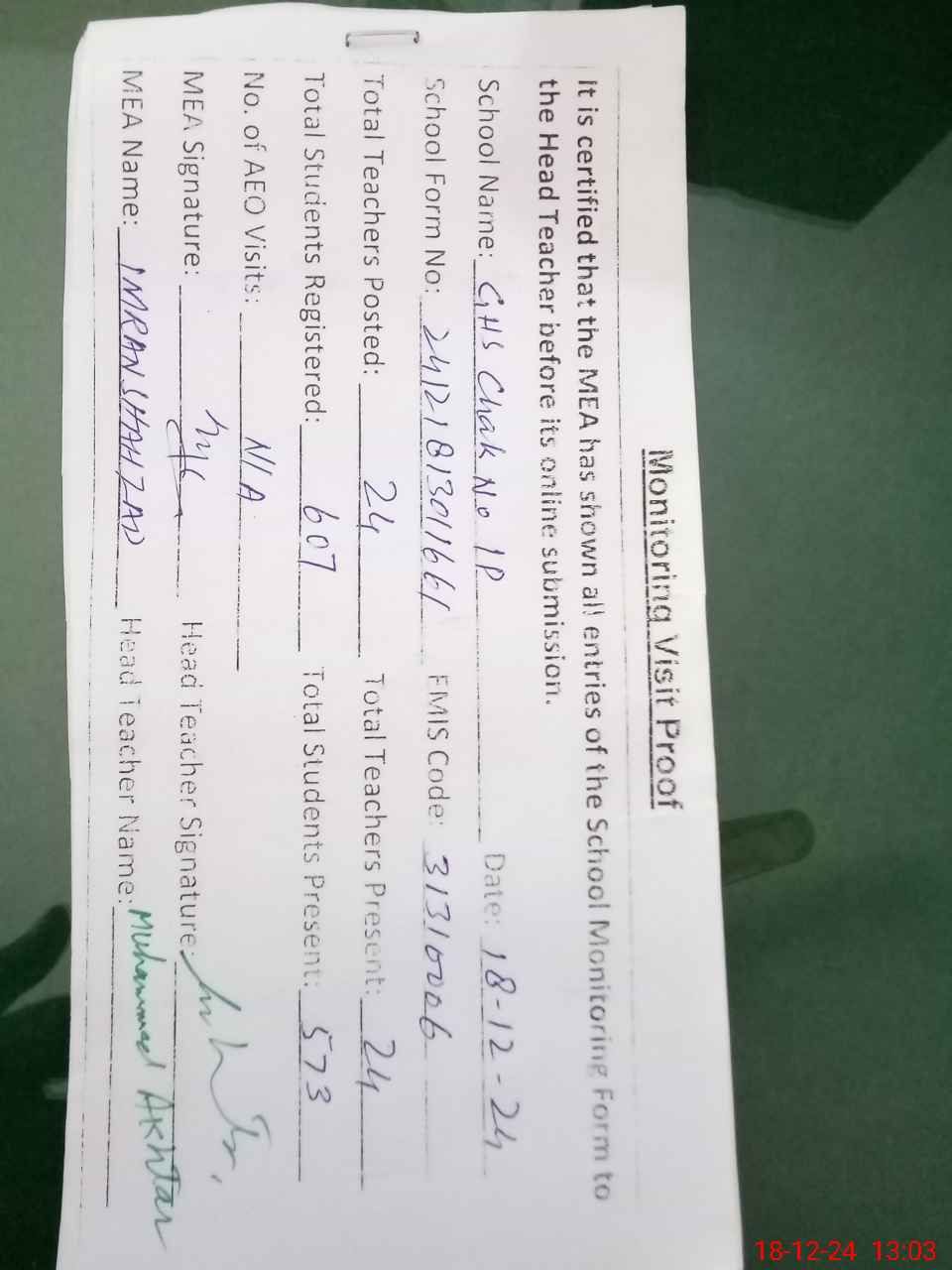 | Attendance Register | Head Teacher | MEA with School | Visit Proof |