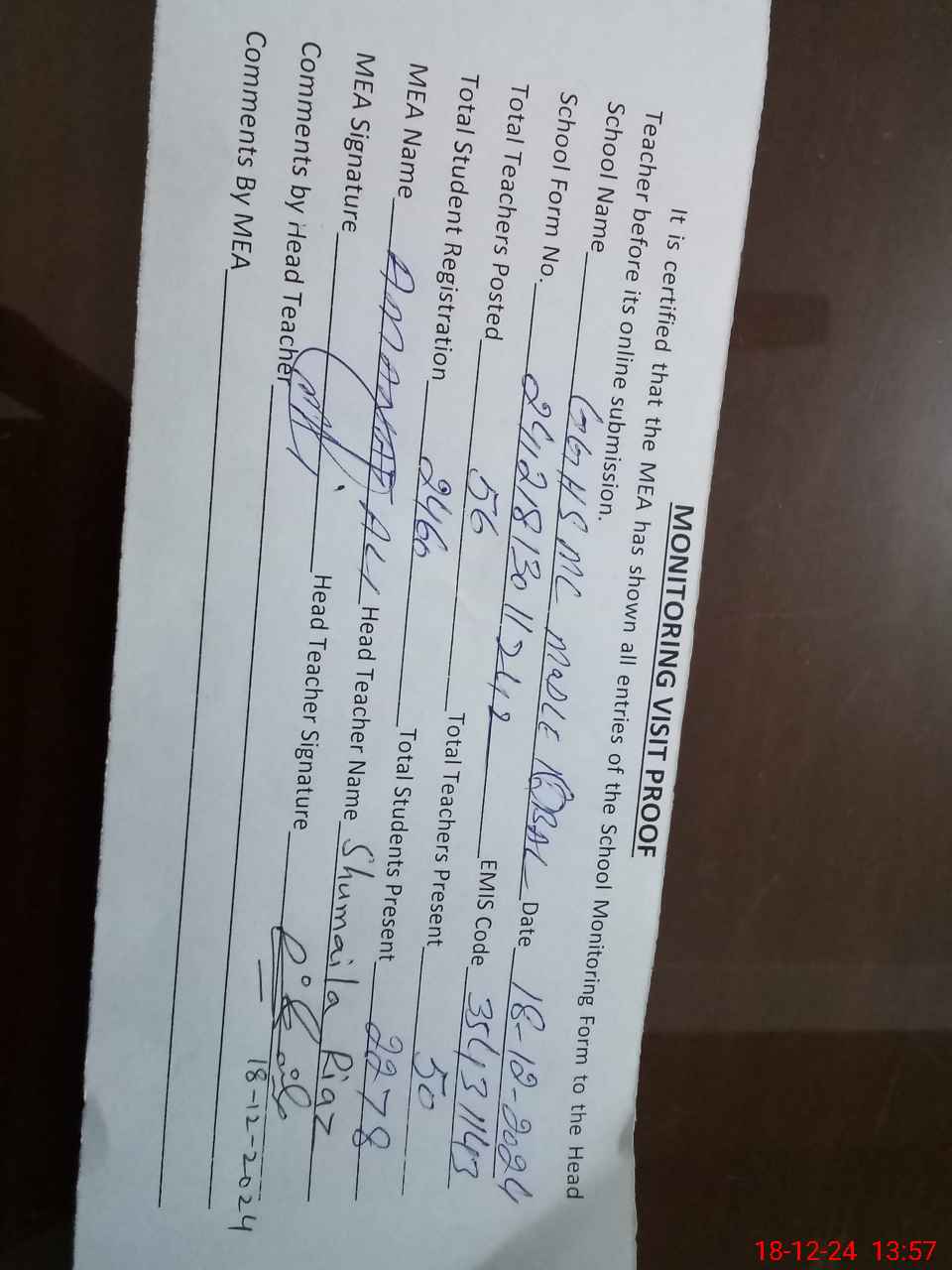| Certified that this School was Inspected by the Undersigned MEA/DMO Today and the Information Stated Above is as Per Record. | |||||