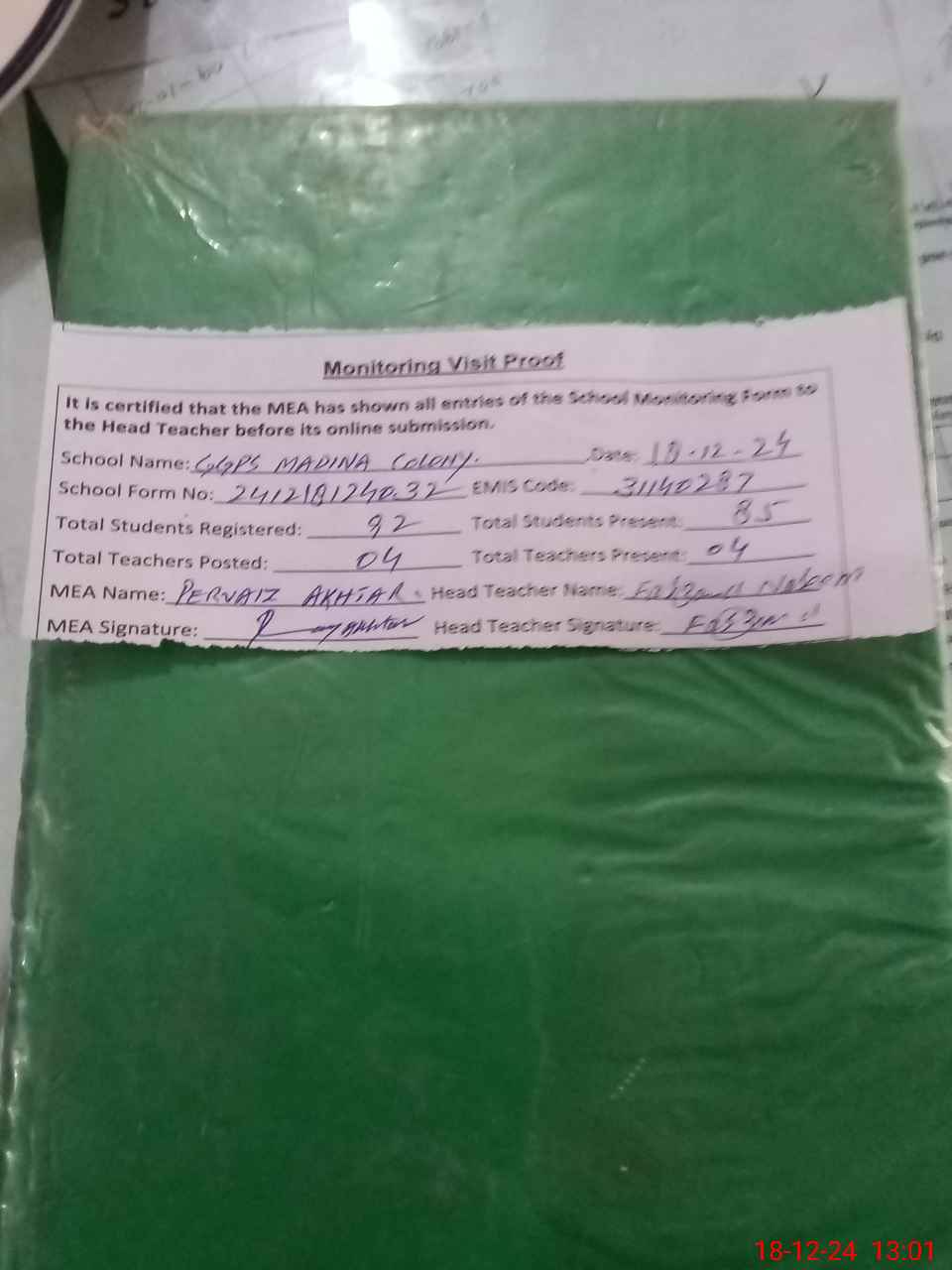 | Attendance Register | Head Teacher | MEA with School | Visit Proof |
