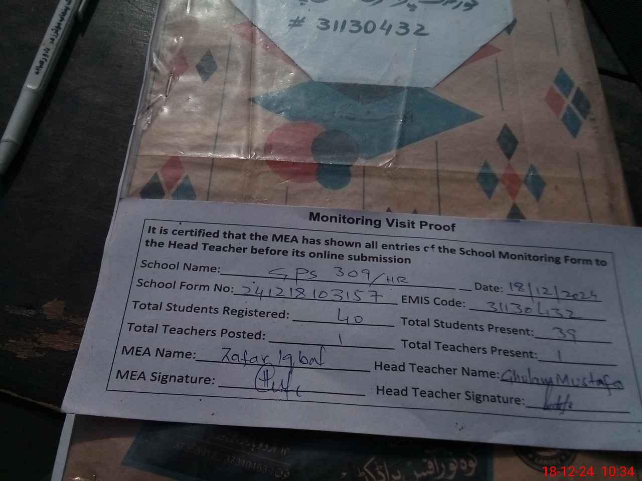 | Attendance Register | Head Teacher | MEA with School | Visit Proof |