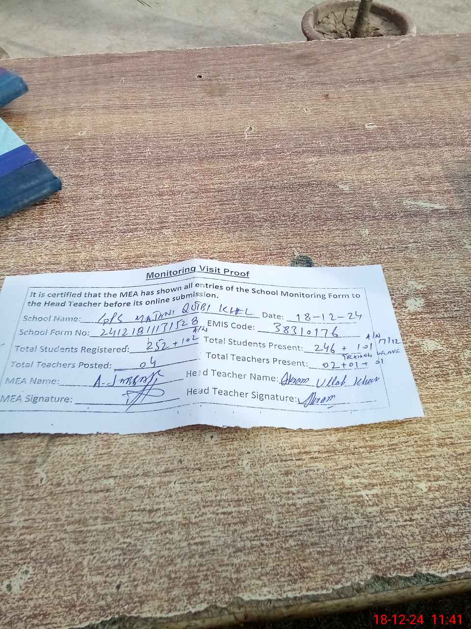 | Attendance Register | Head Teacher | MEA with School | Visit Proof |